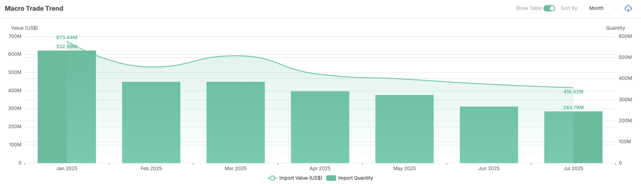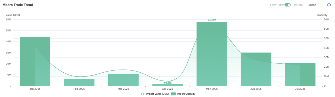 Overall imports reached 200.97 million kg from January to July, but the monthly pattern is unstable—sharp surges (e.g., May’s explosive rebound) followed by steep declines illustrate a market still reacting to overlapping policy actions.