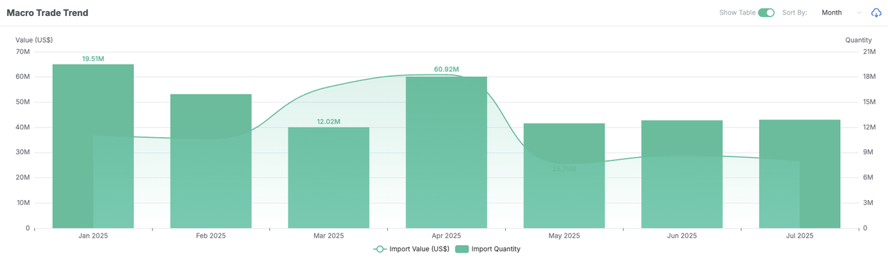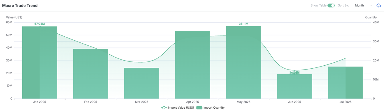- May’s massive MoM spike in U.S. import volume (+2780.44%) reflects buyers briefly capitalizing on competitive Turkish supply before new trade actions took effect.